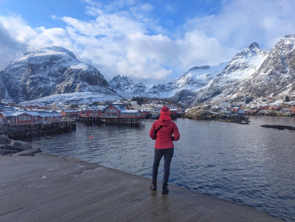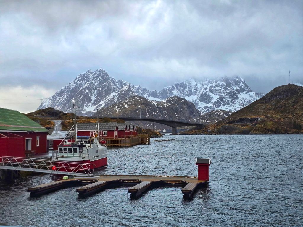 We wandered the waterfront, watched fishing boats come and go, and visited some coffee shops.  The backdrop is pure dramaโ€”jagged mountains towering behind rows of red rorbuer and boats bobbing on calm Artic water.