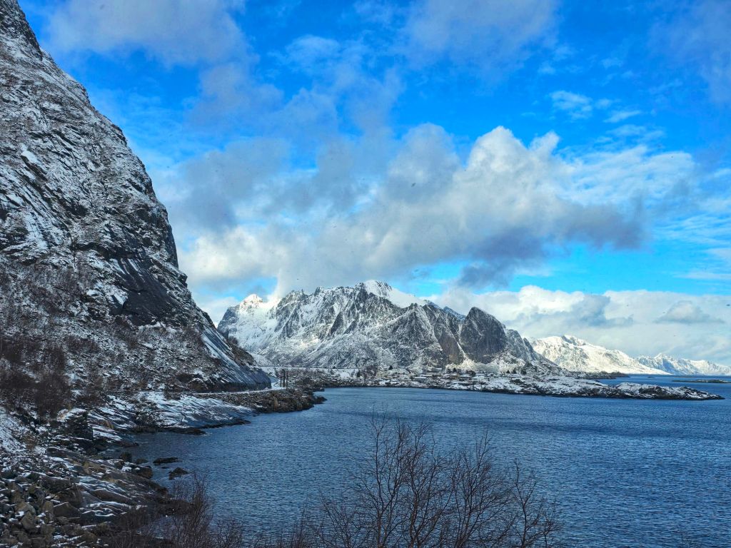 The drive into the Lofoten Islands was everything we had imaginedโ€”and more. This place had been on our list for so long, and now, finally, we were here. Towering peaks rose straight from the sea, their jagged, snow-covered summits contrasting against the dark waters. The bridges, tunnels, winding roads, and scattered fishing villages made it feel like we were driving through a postcard.