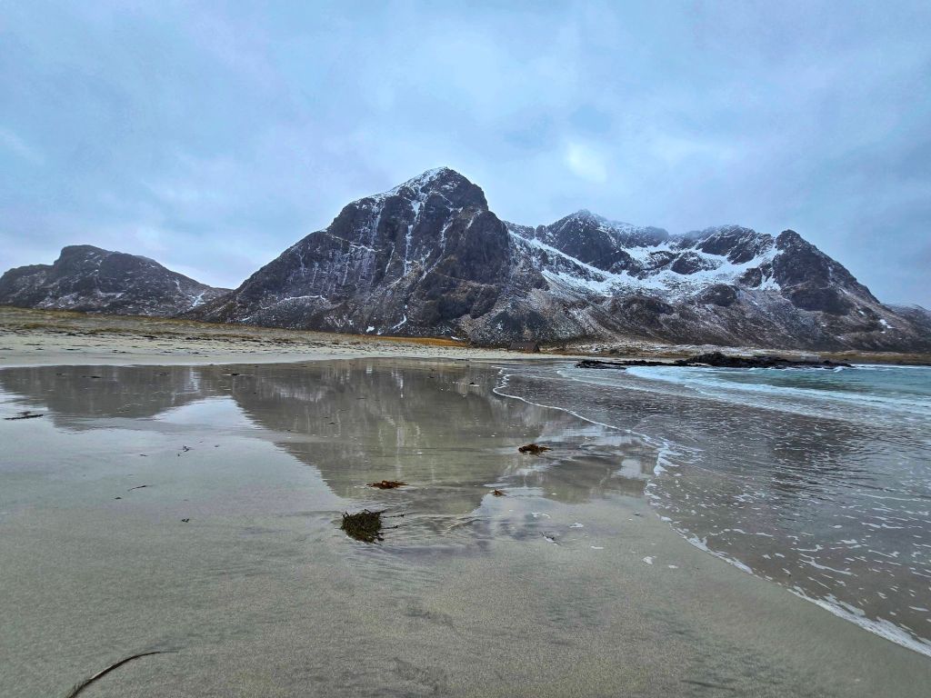 April in Lofoten, and we were gifted one of those rare, calm daysโ€”not a lot of wind, soft light, and a stillness that made the landscape feel even more magical. We began at Uttakleiv Beach, where the white sand and crystal-clear water could almost trick you into thinking you were somewhere tropicalโ€”apart from the chill or until you looked up at the snow still clinging to the surrounding mountains, a beautiful reminder of where we really were.