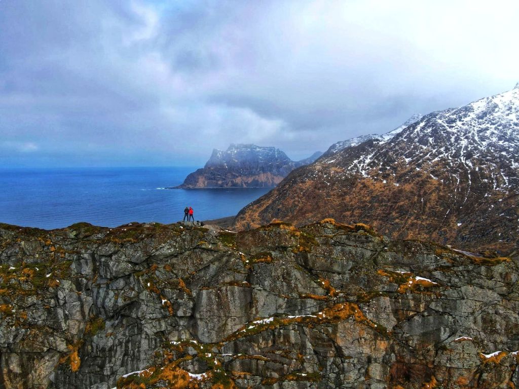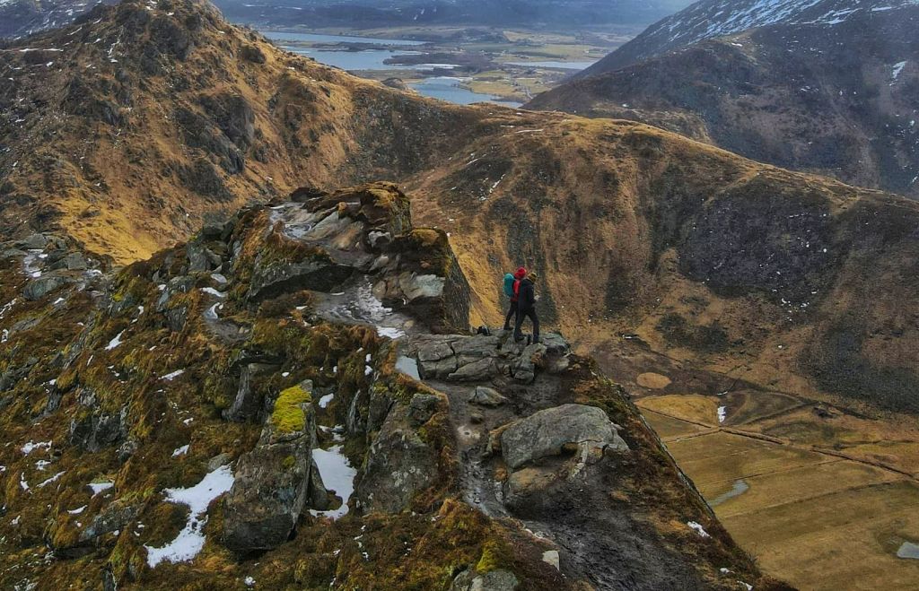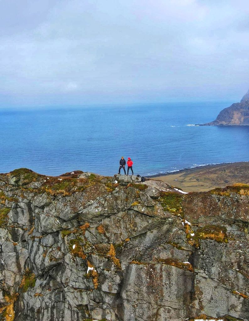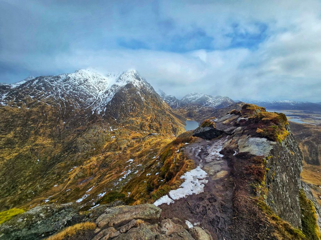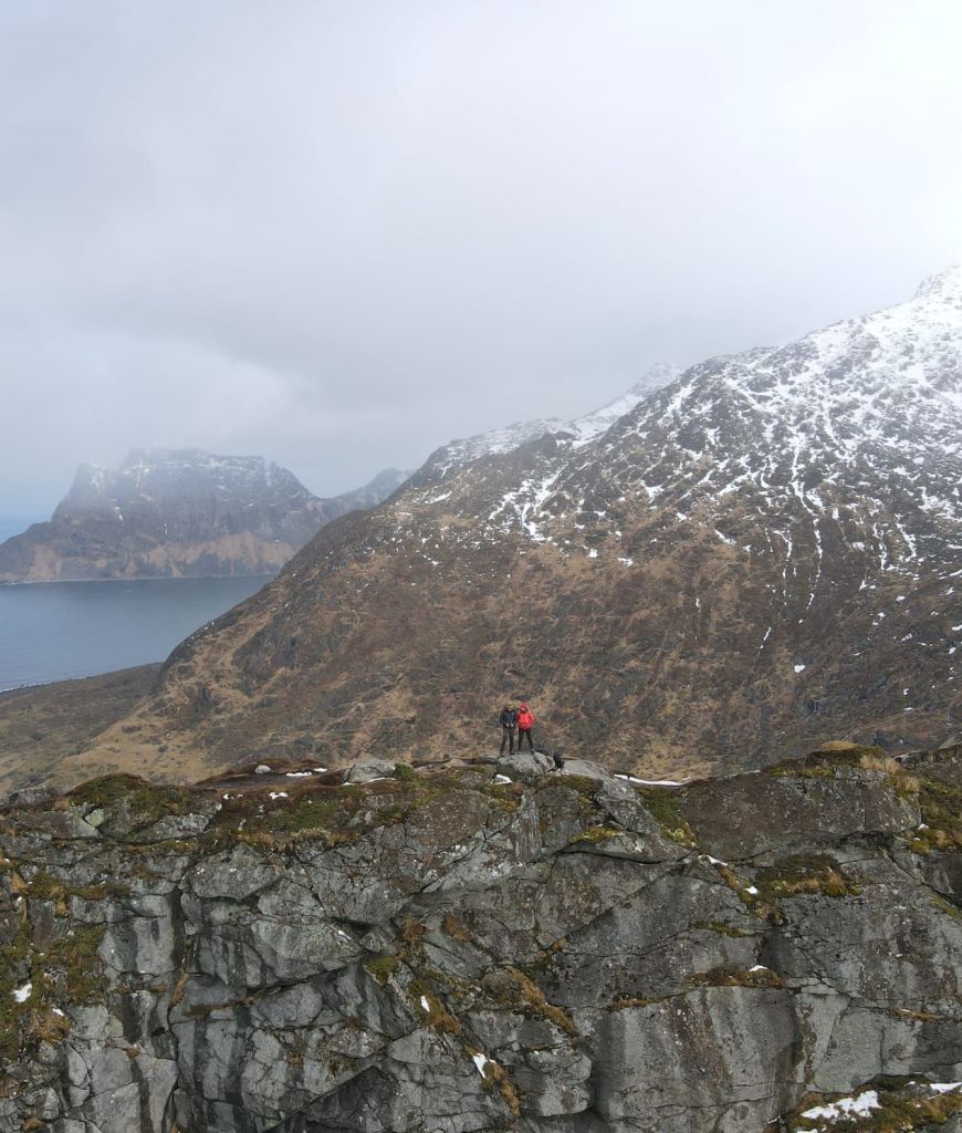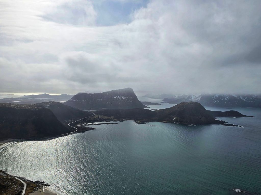 From the summit, we looked out over Uttakleiv and Haukland beaches, with the calm sea stretching out below and snow-covered peaks surrounding us on all sides.