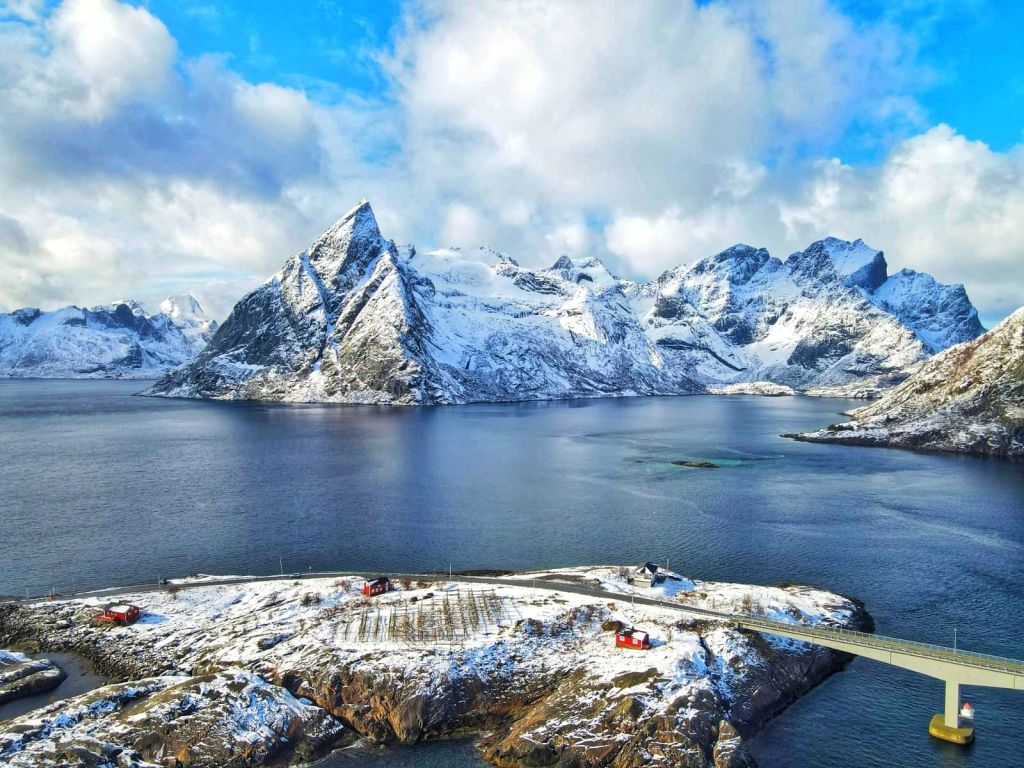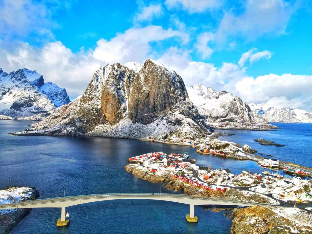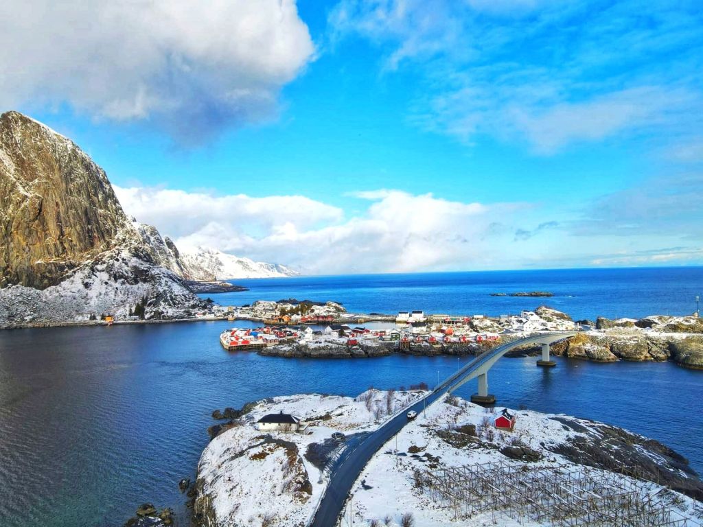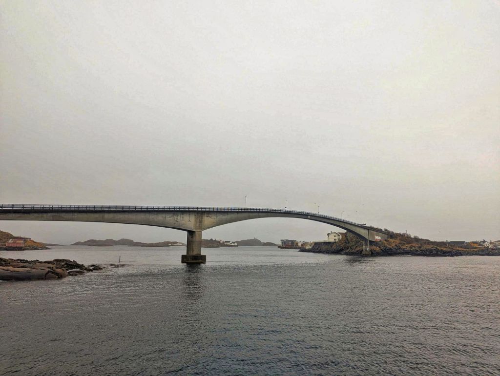 As we crossed yet another stunning bridge, Hamnรธy came into viewโ€”a tiny island surrounded by wild Arctic waters, framed by dramatic peaks.