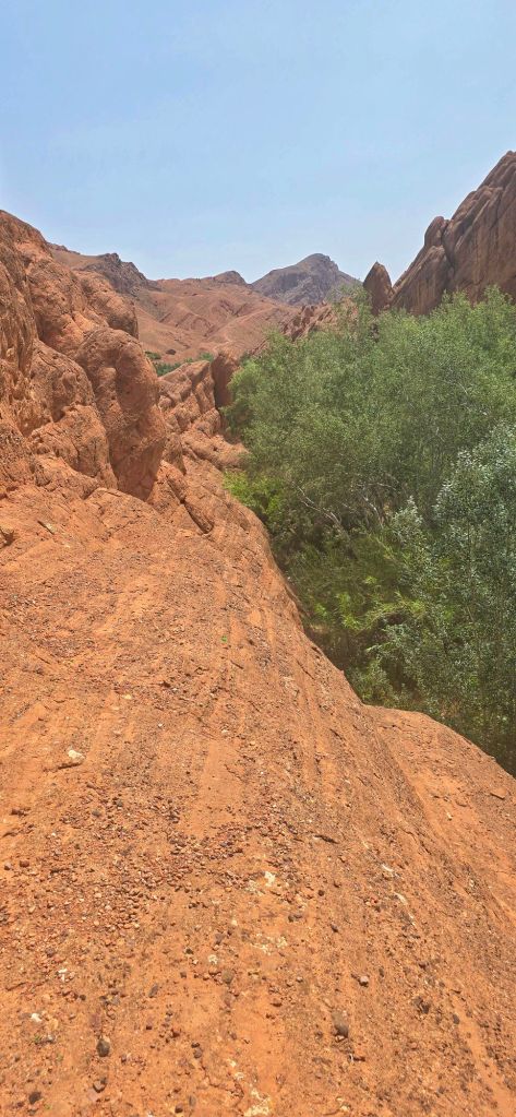 We walked between the sheer rock faces, some stretching up to 300 metres high, their colours shifting with the light, burnt orange, dusky pink and golden in the sun. The air was cooler here, funnelling through the narrow passage and echoed with the sound of footsteps, rushing water and the occasional call to prayer drifting from the nearby village.