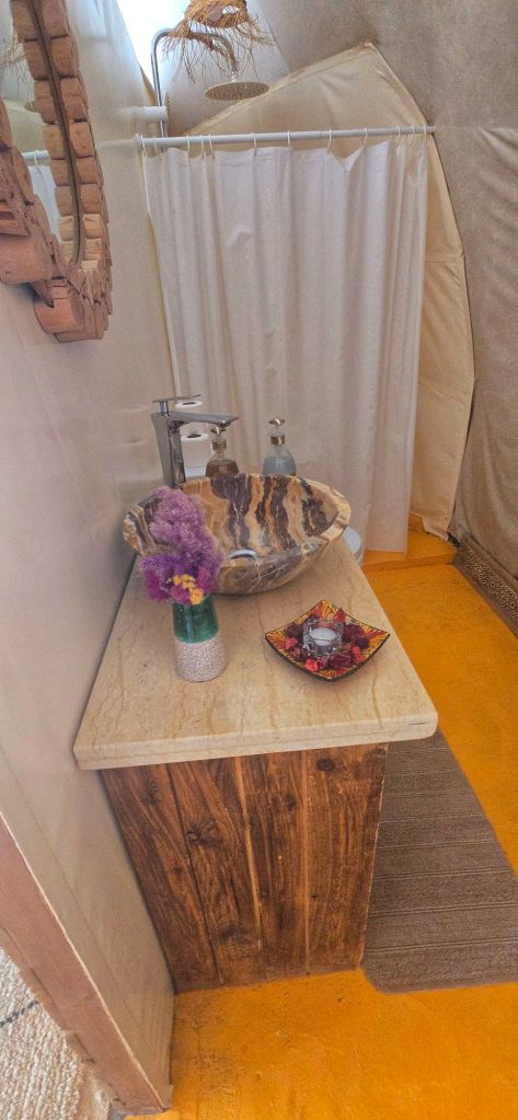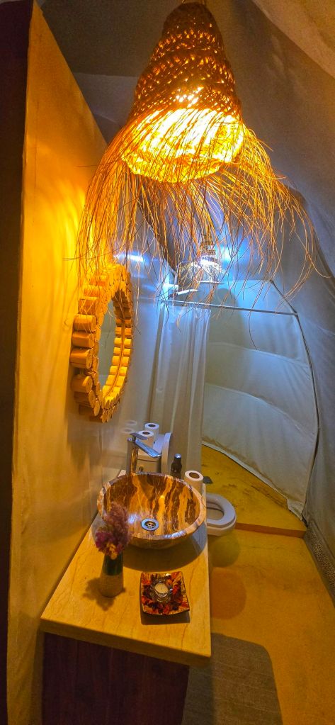 Tucked away in the vast golden dunes near Merzouga, our dome felt like something out of a sci-fi film meets desert dream. Think plush bedding, mood lighting and glass walls that opened up to uninterrupted desert views and stargazing straight from bed.