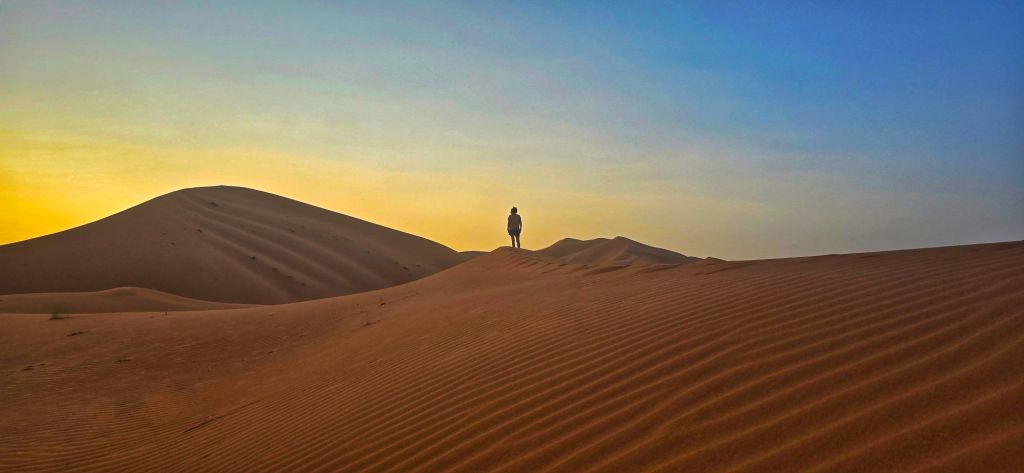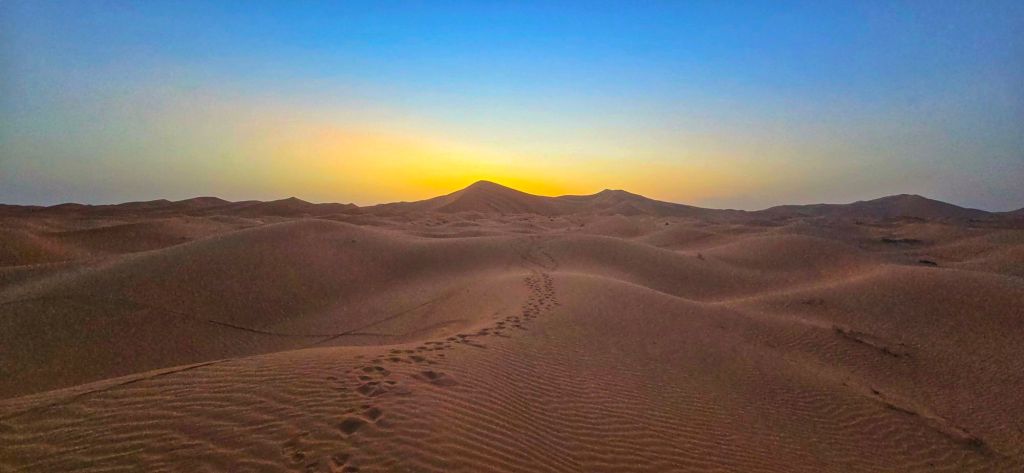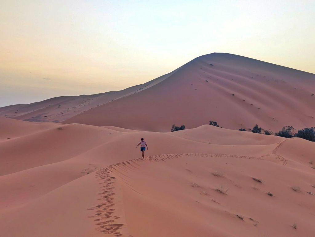As the sun dipped behind the dunes, the heat gave way to coolish desert air. We climbed a nearby dune to catch the sunset, the sand warm beneath our feet, the horizon painted in pinks and golds.