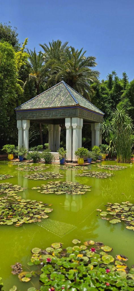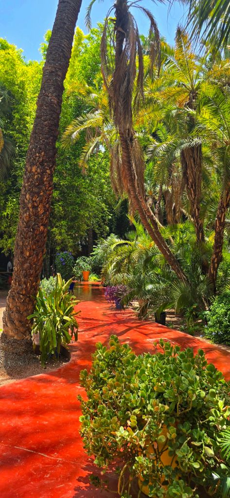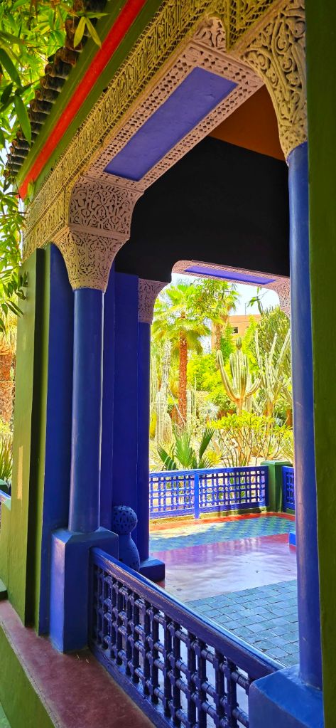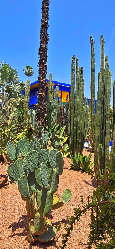 We visited Jardin Majorelle, tucked away in the chaos of Marrakechโ€™s medina, this felt like stepping into a dream painted in bold strokes of cobalt blue and palm green. Originally created in the 1920s by French artist Jacques Majorelle as his personal oasis, the garden was later rescued and revived by fashion icons Yves Saint Laurent and Pierre Bergรฉ in the 1980s.