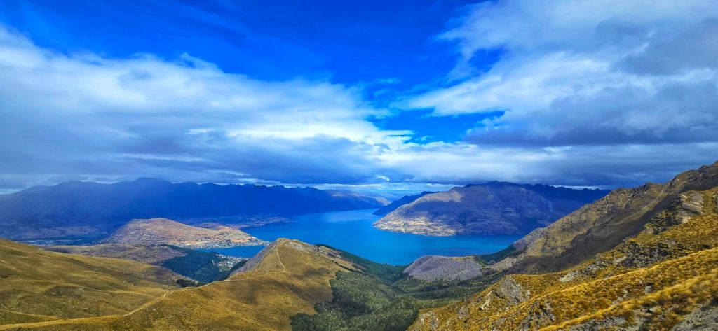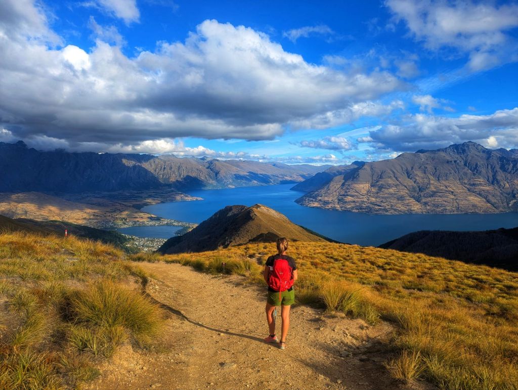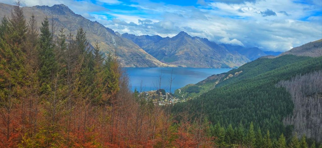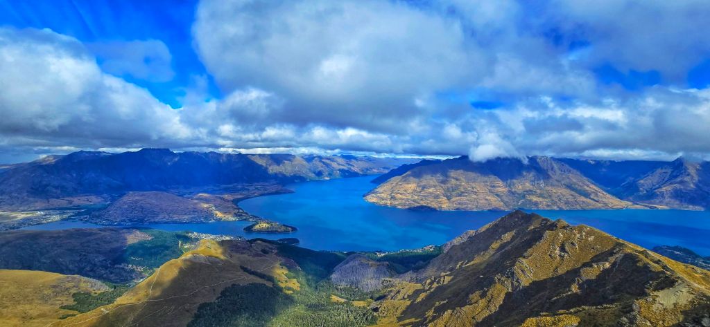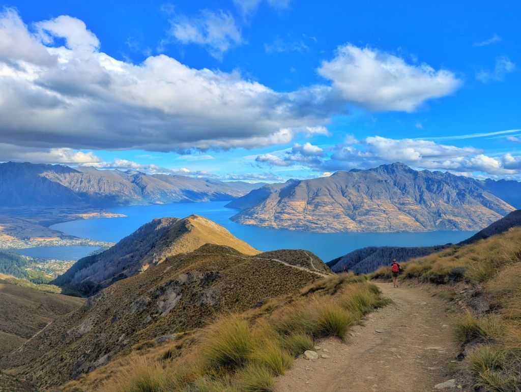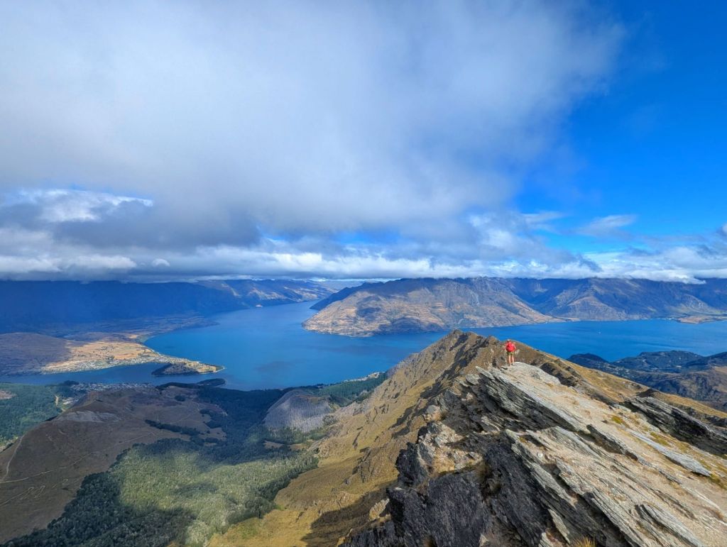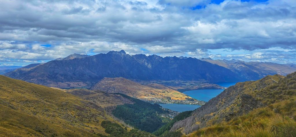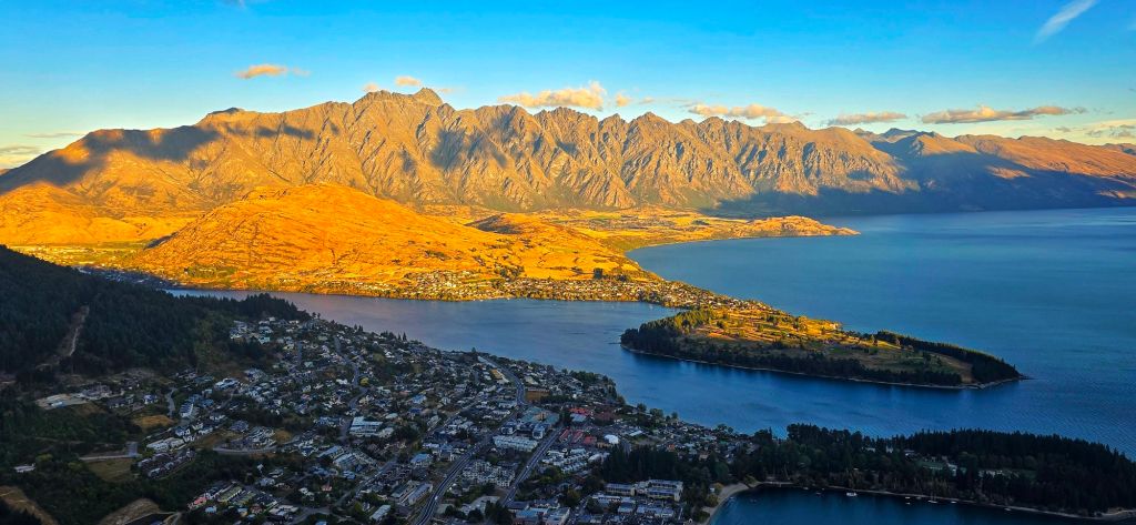 Looking down over Lake Wakatipu, with Queenstown tucked beside the lake and the dramatic peaks of The Remarkables rising in the distance, it was one of those moments where you just stop and take it all in.