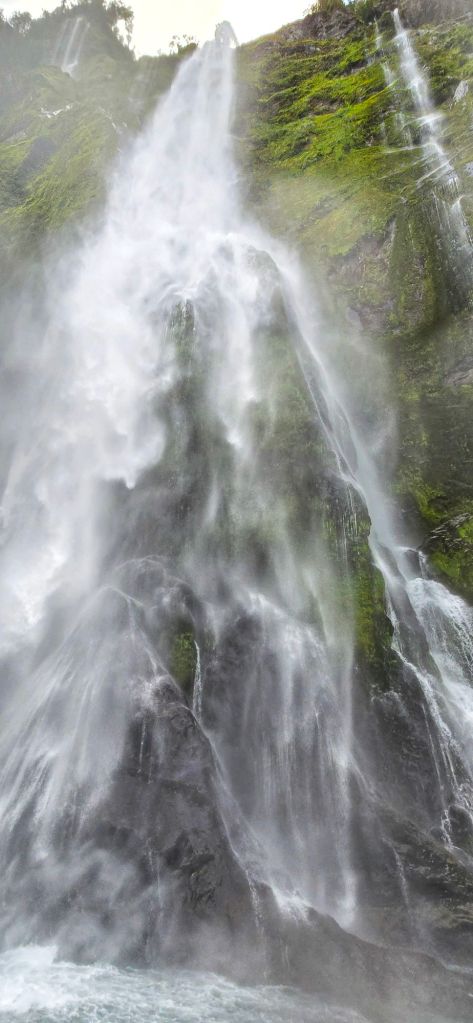 And then…at one point the captain steered the boat right up close to Stirling Falls.ย Close enough that we stood on deck pretty much underneath it, feeling the spray as the water crashed down.